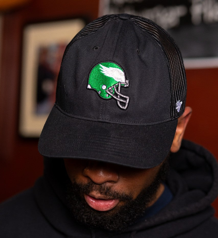 Officially licensed Philadelphia Eagles Men's Historic Helmet Black Trucker hat from '47 Brand. Features the old school Eagles helmet that will impress even the toughest fans at the Linc! Plastic adjustable strap.