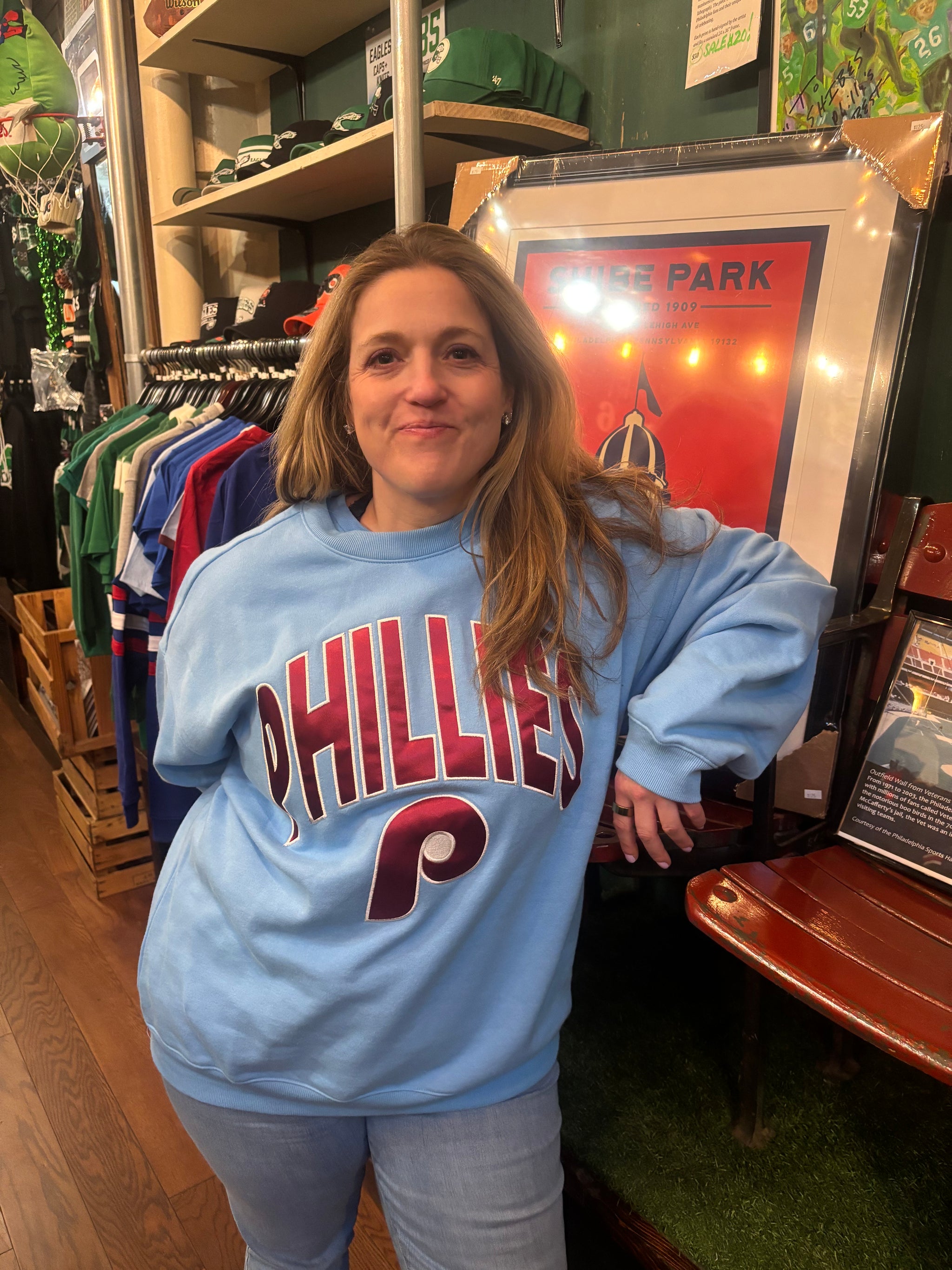 Officially licensed Philadelphia Phillies Carolina Extra Innings Oversized Crew - women's. Throwback sport fleece design with an oversize "boyfriend" fit.